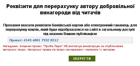 Виходячи з вище сказаного на сайті «Проба Пера» для авторів вводиться можливість в картці Профілю вказати свої банківські реквізити або дані електронного гаманця, які автоматично будуть виводитись в спеціальному інформаційному блоці в кінці кожної авторської публікації в загальному доступі.